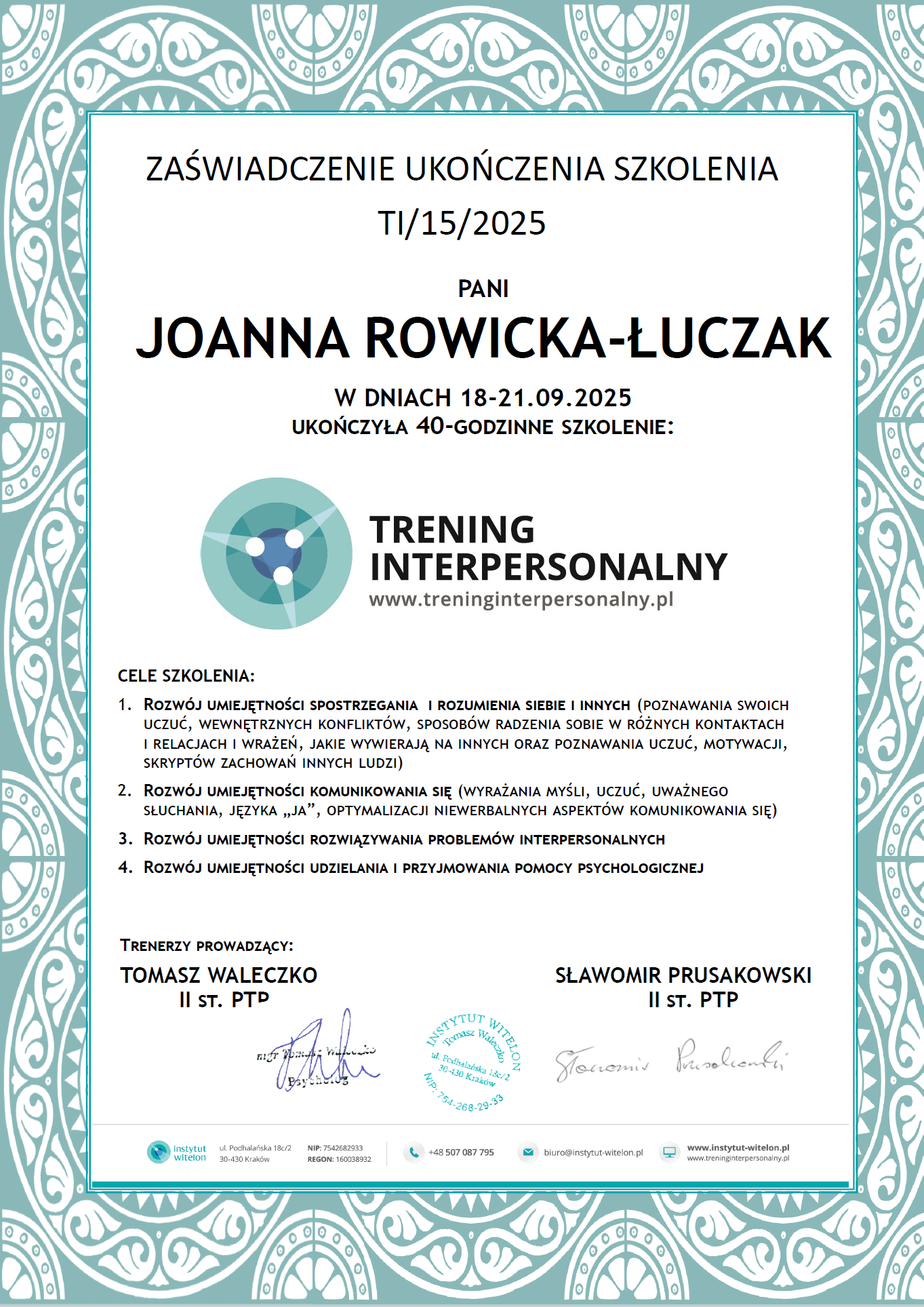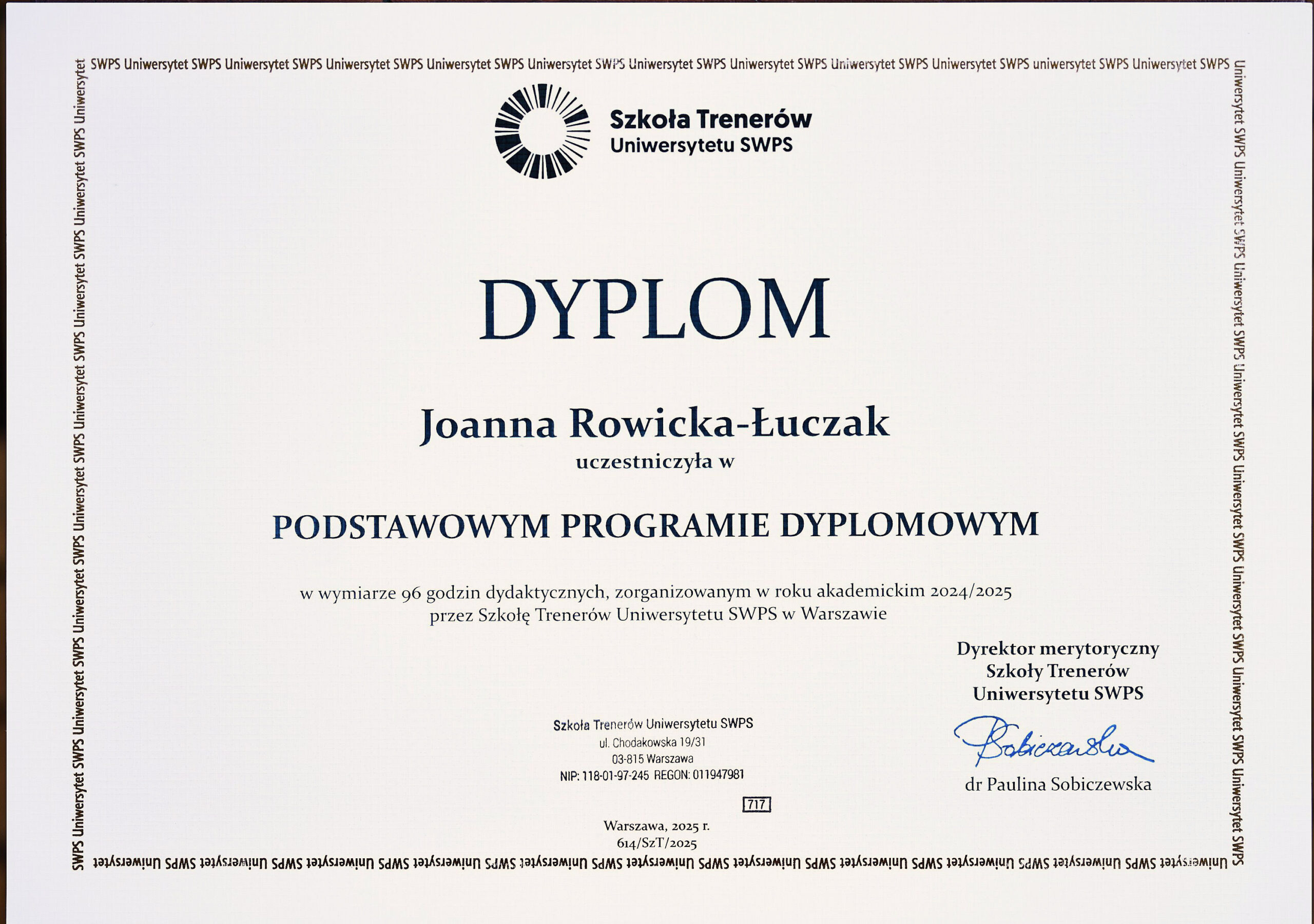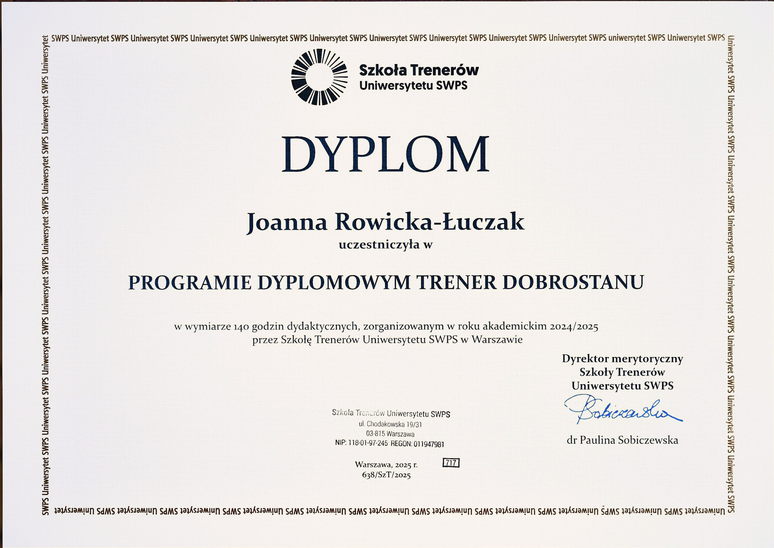Ukończyłam Akademię Trenerów Uniwersytetu SWPS w Warszawie ze specjalizacją trenerki dobrostanu. Chcąc połączyć moje dotychczasowe doświadczenie wraz z nabytymi umiejętnościami, postanowiłam stworzyć taką przestrzeń, która zawsze będzie wspierać nie tylko mnie, ale i osoby ze mną współpracujące.